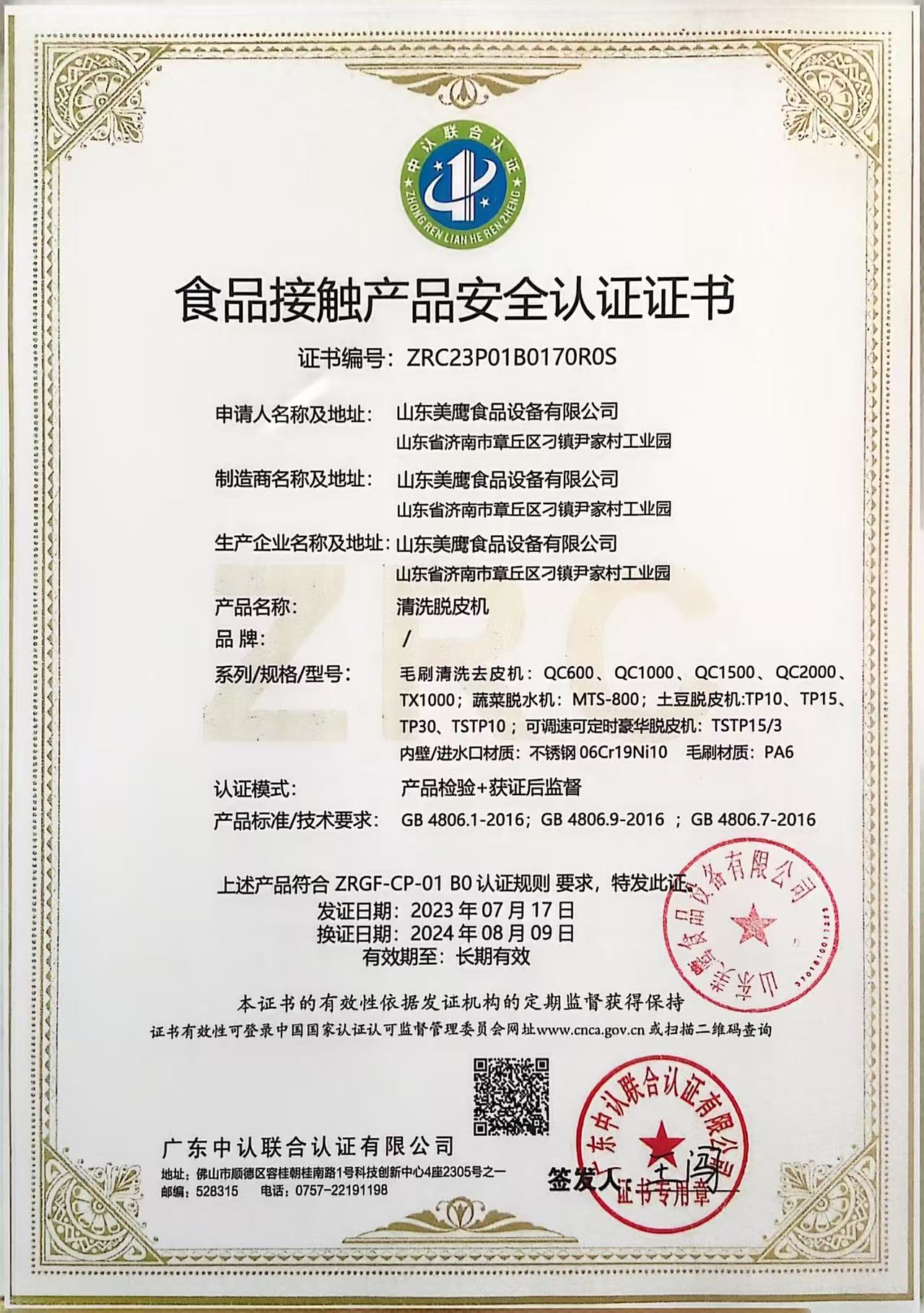 食品接觸產(chǎn)品安全認(rèn)證(清洗脫皮機(jī))
